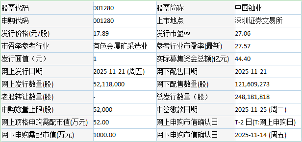 中国铀业股份有限公司保荐人(主承销商):中信证券股份有限公司 联席主承销商:中信证券股份有限公司 发行情况: 公司简介:中国铀业股份有限公司是一家以天然铀及共伴生放射性矿产资源综合利用为主的矿业公司。报告期内,公司主要从事铀自然资源的开采、冶炼、销售和营销,以及独居石、铀钼、钽、铌等共伴生放射性矿产资源产品的综合利用和销售。截至招股说明书签署日,中核铀业直接持有中国铀业1,197,043,120股,持股比例为65.77%,为公司第一大股东。中核集团间接控制通过中核铀业、朝日核基金、中国核电、中国原子能、核冶金研究院、中核大地等公司持有中国铀工业79.48%的股份,成为中国铀工业的实际控制者。根据中国铀业2025年11月13日发布的首次公开发行股票及主板上市招股书,公司计划募集资金41.1亿元,用于天然铀产能项目、伴生放射性矿产资源综合利用项目及补充流动资金。中国铀业集团公司于2025年11月20日首次公开发行股票并在主板上市,募集资金41.1亿元将用于公司投资项目。按发行价格17.89元/股计算,公司拟募集资金总额443,997.27万元。扣除预计发行费用后所得款项净额约人民币 77,347,30 元0(不含增值税)预计为436,262.54万元。