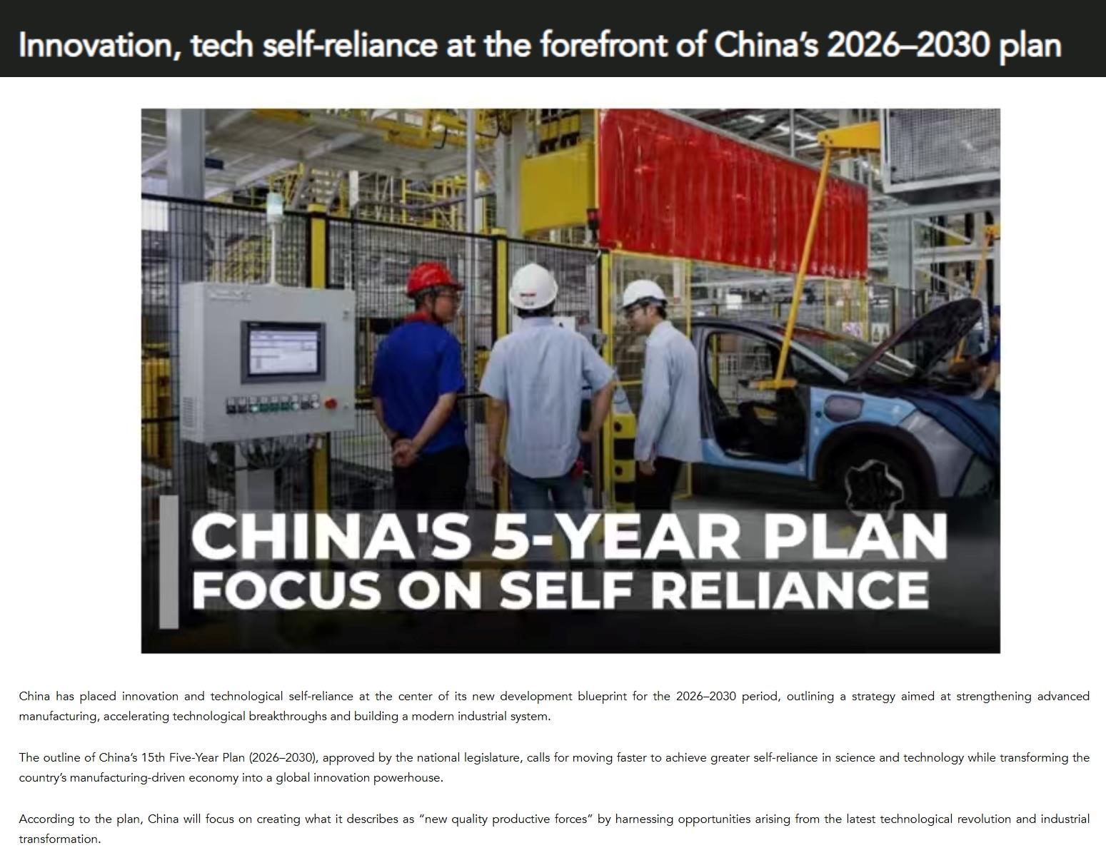 巴基斯坦独立通讯社近日发表了一系列聚焦中国“十五五”规划的报道。报告认为,未来五年,中国将加快先进科技自主化,大力扩大消费,同时高度重视文化产业发展,实现硬实力和软实力双向提升。创新、技术独立和自给自足占据重要地位。文章认为,中国在“十五五”规划中将创新、技术自主、自力更生置于新发展规划的中心位置。 《规划》确立了增强高端制造、加快技术创新、提升科技创新能力等一系列战略方针。形成现代产业体系。根据规划,中国将抓住新一轮科技革命和产业变革机遇,着力发展新产能。巴基斯坦独立通讯社报道截图分析认为,建设以高端制造为主的现代工业体系成为“十五五”规划草案的重点议题。规划强调,要推动研发成果商业化应用,加强技术创新与产业应用的衔接。该计划还提出了一系列新的重大科技基础设施项目,以支持前沿研究和创新。文章指出,“十五五”规划方案也强调数字技术与实体经济深度融合。我国“AI+”倡议旨在加速人工智能在关键领域的应用产业发展,支持新型智慧经济发展。同时,规划强调科技领域高水平开放和国际合作。文章举例说,目前中国与许多国家签署了120项政府间科技合作协议。文章认为,“十五五”规划提出的创新驱动战略将加速产业现代化,支撑经济长期发展,助力中国向现代化目标迈进。促进消费,建设强大国内市场 文章指出,“十五五”期间,中国将提高居民消费占GDP的比重,内需将拉动经济增长。他指出,未来计划发挥更大作用,政府还计划通过加快技术创新,打造经济增长新引擎。具体措施包括应用人工智能技术促进传统产业改造和现代化,做大做强集成电路、低地经济等新兴产业。巴基斯坦独立通讯社报道截图称,根据该计划,中国还将不断扩大制度开放,争取互利共赢的国际合作。具体措施包括扩大市场准入,包括推动增值通信、生物技术等行业的开放。此外,扩大数字领域开放,减少外资准入负面清单。同时,中国将按照严格的国际经贸标准扩大对外开放,为外商投资企业创造更好的发展环境。 “绘制一个新模组《文化强国》指出,在推进中国式现代化进程中,文化建设与经济发展、科技创新同等重要。“十五五”规划纲要对加强文化信任、优化公共文化服务供给、促进文化产业发展提出了明确要求。巴基斯坦独立通讯社报道截图认为,文化遗产项目将有助于就业和地方经济发展。文章援引最新数据。截至目前,中国已建设约1.3万个文化遗产项目文章进一步分析,近年来,中国文化产业日益受到国际关注,动画电影、游戏、网络文学等文化作品备受关注。受到世界各地观众的喜爱。文章最后指出,文化建设在国家发展中占有重要地位,体现了我国在向2035年全面建设社会主义现代化国家远景目标迈进过程中推动物质文明和精神文明协调发展的战略部署。央视环球资讯编译|王焕兴签字审核|王茜出品 |邹浩宇