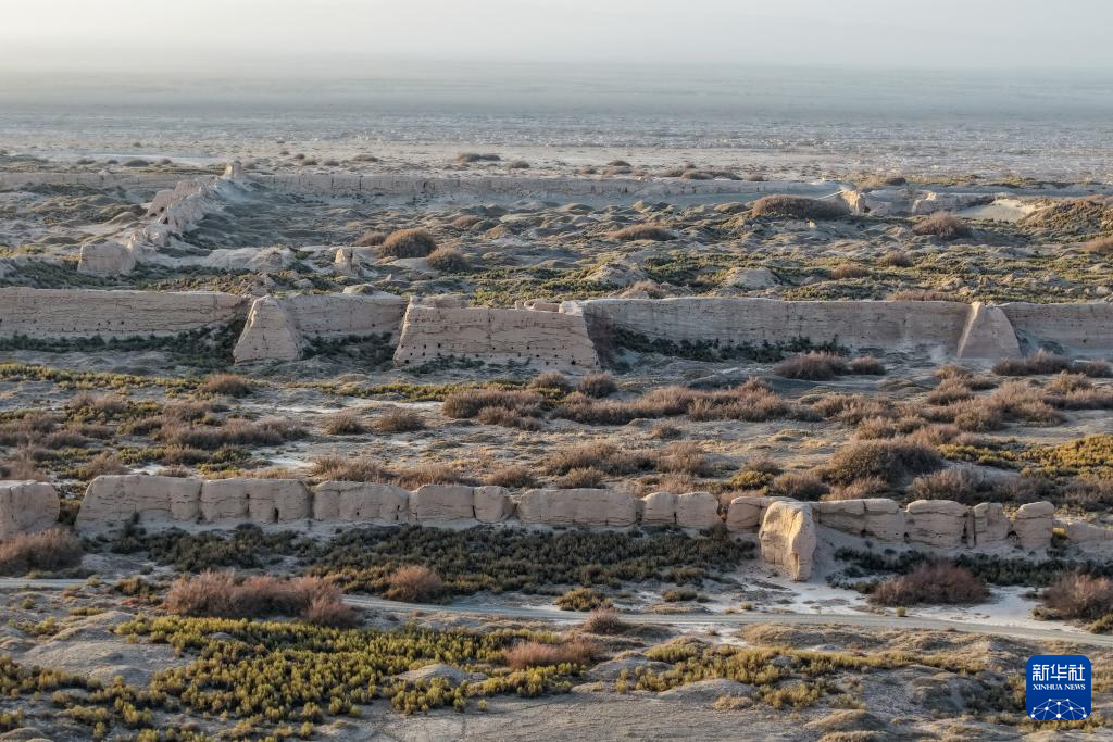这是11月18日在甘肃省果州县拍摄的宿阳城遗址(无人机照片)。宿阳城遗址位于甘肃省酒泉市果州地区宿阳市东南部的戈壁滩上。主要由洛阳城遗址、达尔庙遗址、农运河遗址、洛阳城陵墓组成。是边防重镇和丝绸之路交通枢纽。 2014年,作为丝绸之路长安天山走廊路网的一部分被列入世界文化遗产。新华社记者 蓝冰冰 供图