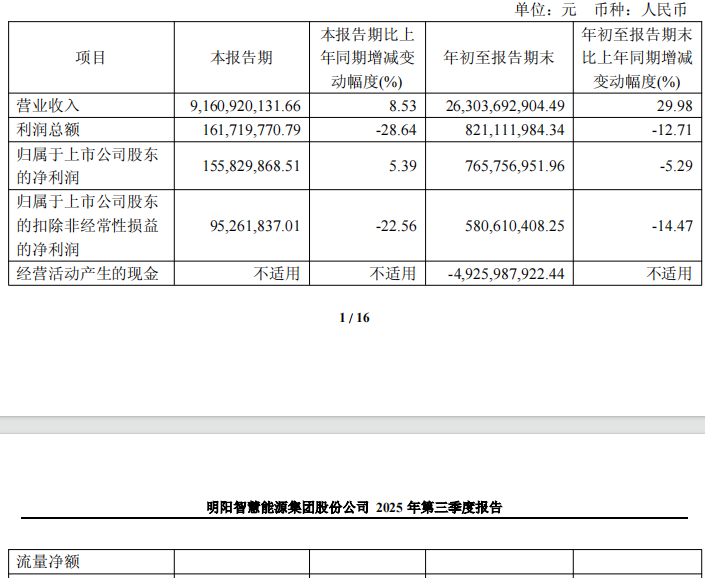 中国经济网北京10月31日电 明阳智能(601615.SZ)昨晚发布2025年三季度报告显示,今年前三季度,公司营业利润263.04亿元,较去年同期增长29.98%。归属于上市公司股东的净利润7.66亿元,同比下降5.29%。扣除非经常性损益后,归属于上市公司股东的净利润5.8亿元,比上年同期下降14.47%。经营活动产生的现金流量净额为-49.26亿元。明阳智能于2019年1月23日在上海证券交易所挂牌上市,发行价格为4.75元/股。本次公开发售A股数量总股本为2.759亿股,全部为新股,不转让老股。上市保荐人为申万宏源证券承销保荐有限责任公司,保荐代表人为赵锐先生、袁强先生。明阳智能发行募集金额总额为1,310,525,000元。扣除发行费用后,融资净额为1,235,389,000元。明阳智能招股书显示,明阳智能初步计划募集资金123,538.9万元,将用于阳江高新区明阳风电机组装备制造成套项目、阳江高新区明阳风电机组设备叶片制造项目、恭城低风速试验风电项目和靖边明阳宁昭梁二期风电项目。发行费用总额为7,514.41万元(不含税),其中认购及保荐费用为增至4798.9万元。据明阳智能2023年上半年募集资金存储及实际使用情况专项报告显示,明阳智能于2019年12月16日采用通过上交所系统向社会公开发行的全部发行方式,通过上交所系统向社会公开发行共计1700万张面值100元的可转债。截至2019年12月20日,公司累计募集资金17亿元。发行成本:1697.99万元,扣除金额后,净融资金额为168302.1万元。扣除发行费用后的募集资金净额将用于资助明阳市100MW风电项目关键部件的开发,并补充流动资金。发起人代表为沈学明先生、袁强先生。明阳智能向特定投资者非公开发行普通股(A股)413,916,713元,发行价格为每股14.02元分享。截至2020年10月26日,公司共收到本次非公开发行募集资金580,311.23万元,不含发行费用3106元。融资净额突破50万元,达577,204.73万元。根据明阳智慧发行计划,扣除发行费用后的募集资金净额将分配给10兆瓦浮式海上风机设计研发项目、汕尾海洋工程基地(陆丰)项目、明阳智能海上风能产业园项目、山东省菏泽市单县北京自由花园项目。东沟河风电项目一期(50兆瓦)、平乐白美风电项目、明阳新县骑龙山风电项目、新县红流100兆瓦风电项目、北京解放园青铜峡峡口风电项目、混合塔生产基地建设项目偿还银行贷款。保荐机构(主理人)为中信证券股份有限公司,明阳智能向特定投资者非公开发行普通股(A股)147,928,994元,发行价格为13.52元/股。截至2022年1月27日,公司已累计收到本次非公开发行募集资金人民币20亿元。扣除发行费用678.89万元后,融资净额为199,321.11万元。明阳的智能发行计划表明,扣除发行费用后的净利润将全部用于补充公司流动资金。保荐机构(主承销商)为中信证券股份有限公司,保荐代表人为汪洋、冼伟戈。明阳智能自2019年上市以来已四次募集资金,募集资金总额1081,363.73万元。 2024年营业利润2715.8万元,比上年减少3.43%。归属于上市公司股东的净利润3.46亿元,同比下降8.12%。归属于母公司的净利润上市公司股东扣除专项扣除后的净利润1.75亿元,比上年同期下降14.25%。 2022年至2024年经营活动产生的现金流量净额分别为-7960亿元、-25.9亿元、-24.3亿元。 2025年上半年,公司实现营业利润171.43亿元,比上年增长45.33%。归属于上市公司股东的净利润6.1亿元,同比下降7.68%。扣除非经常性损益后,归属于上市公司股东的净利润4.85亿元,比上年同期下降12.68%。经营活动产生的现金流量净额为-35.03亿元。